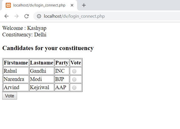 In this page, the user can see the list of candidates in their constituency and vote for the candidate of their choice. Once the user has voted, they cannot vote again for that election.