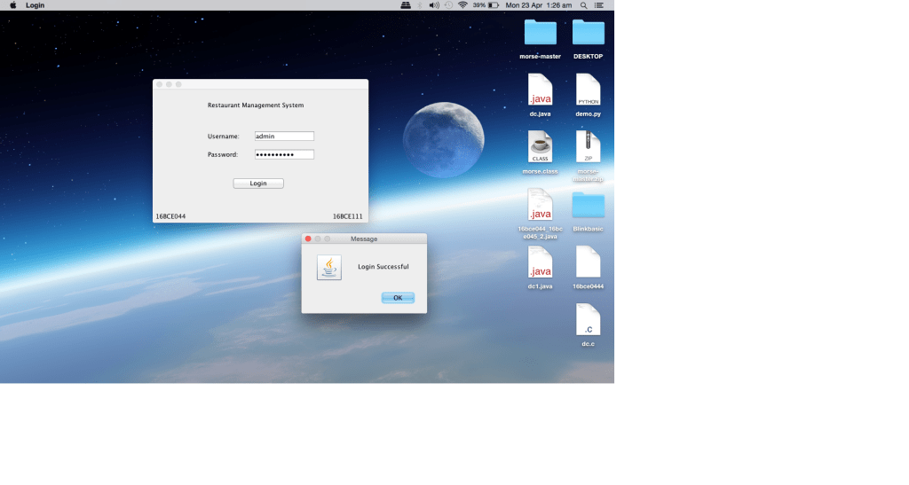 Initially when the program is started, a login screen appears. On entering the valid user name and password; a popup will notify that user has successfully logged in and the main interface of Restaurant Management System is opened.
